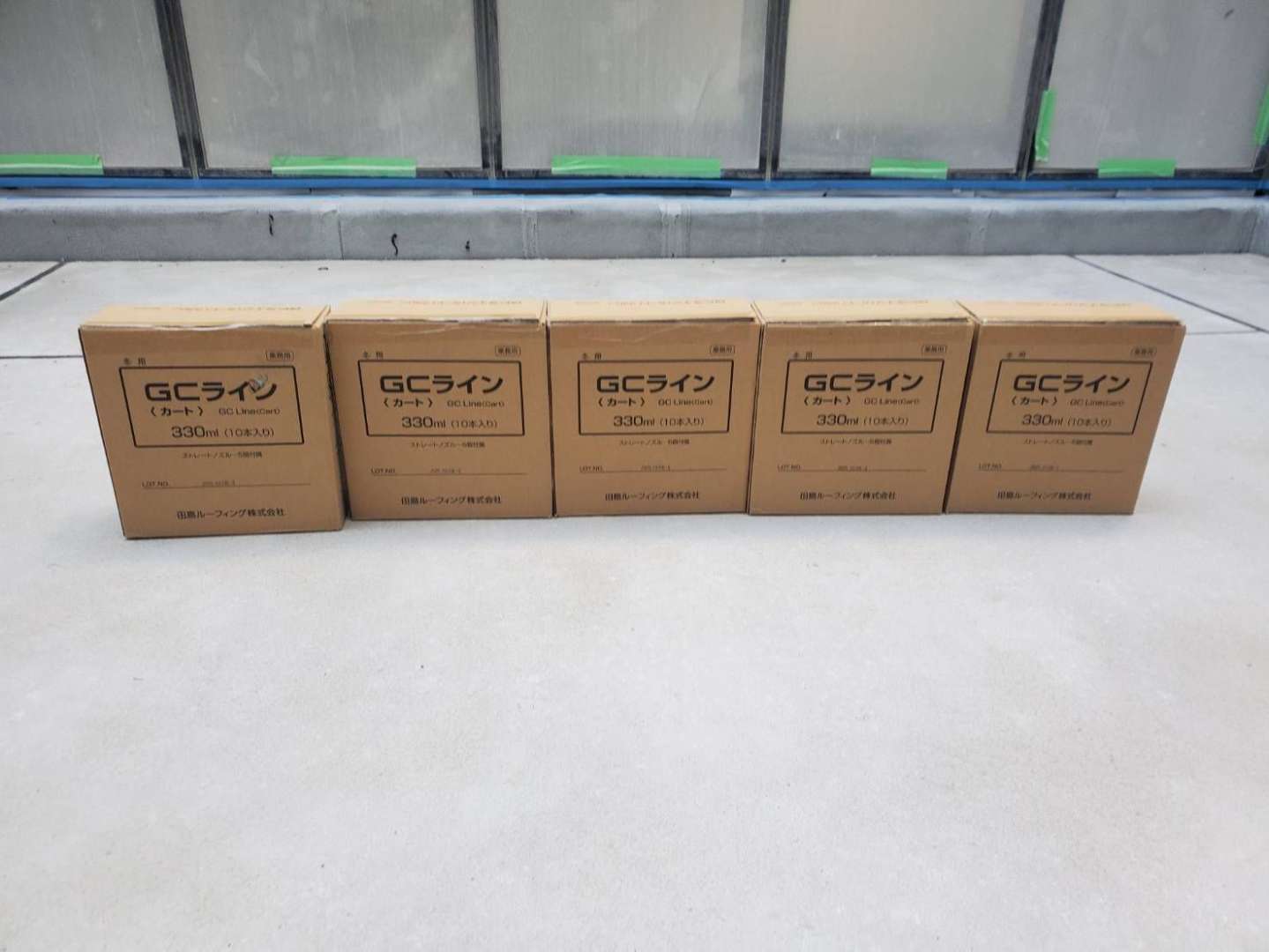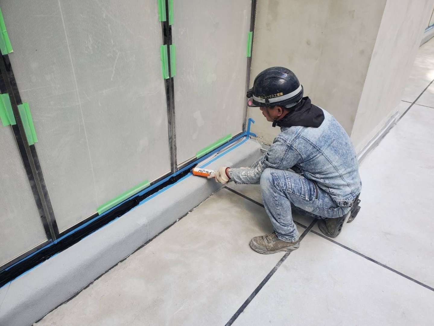アスファルトは油分(可塑剤)を多く含むため、シーリング材の油分移行(ブリード)による変色や接着不良が発生しやすい為、シーリング材メーカーでは推奨される材料の選定が出来ない為、アスファルト防水の接着性を優先して田島ルーフィング のGCラインに使い施工しました。